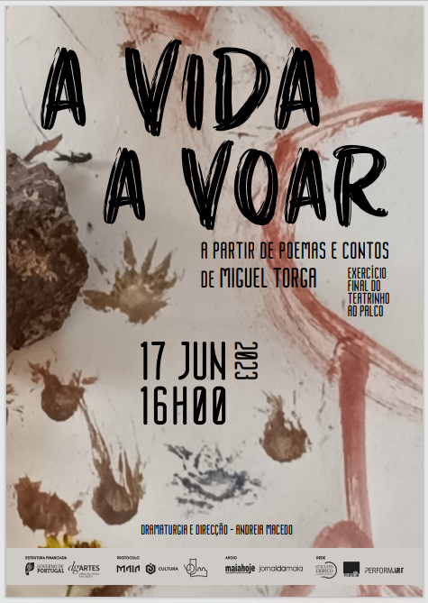 Espectáculo – Exercício Final Oficina Teatrinho ao Palco 2023| A Vida A Voar (a partir de poemas e contos de Miguel Torga) | Elenco – Alice Pereira, Celina Wanderley, Francisca Pereira, João Francisco Saldanha, Joel Pinho, Leonardo Gomes, Olívia Porto, Pedro Oliveira, Raquel Dias, Rodrigo Aral, Rodrigo Macedo, Simone Maia, Xavier Silva